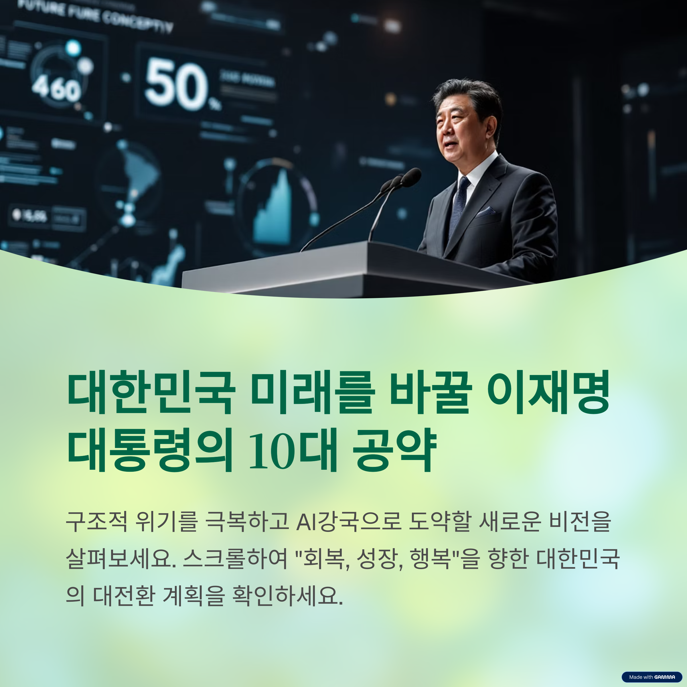 2025년 제21대 대통령에 당선된 이재명 대통령은 "회복, 성장, 행복"이라는 3대 비전 아래, 한국 사회의 대전환을 위한 10대 핵심 공약을 발표했습니다.